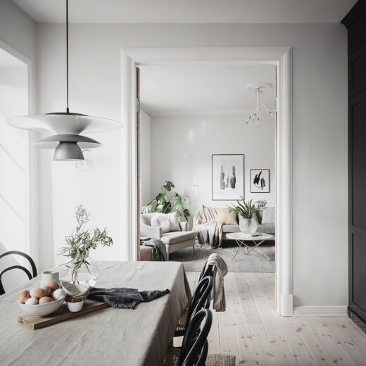 In dieser wunderschönen Wohnung in Göteborg wird eine moderne und dezente Farbpalette gekonnt mit rustikalen Elementen kombiniert. Die hohen Holztüren wurden bewusst nicht gestrichen und lassen die Räume richtig…
